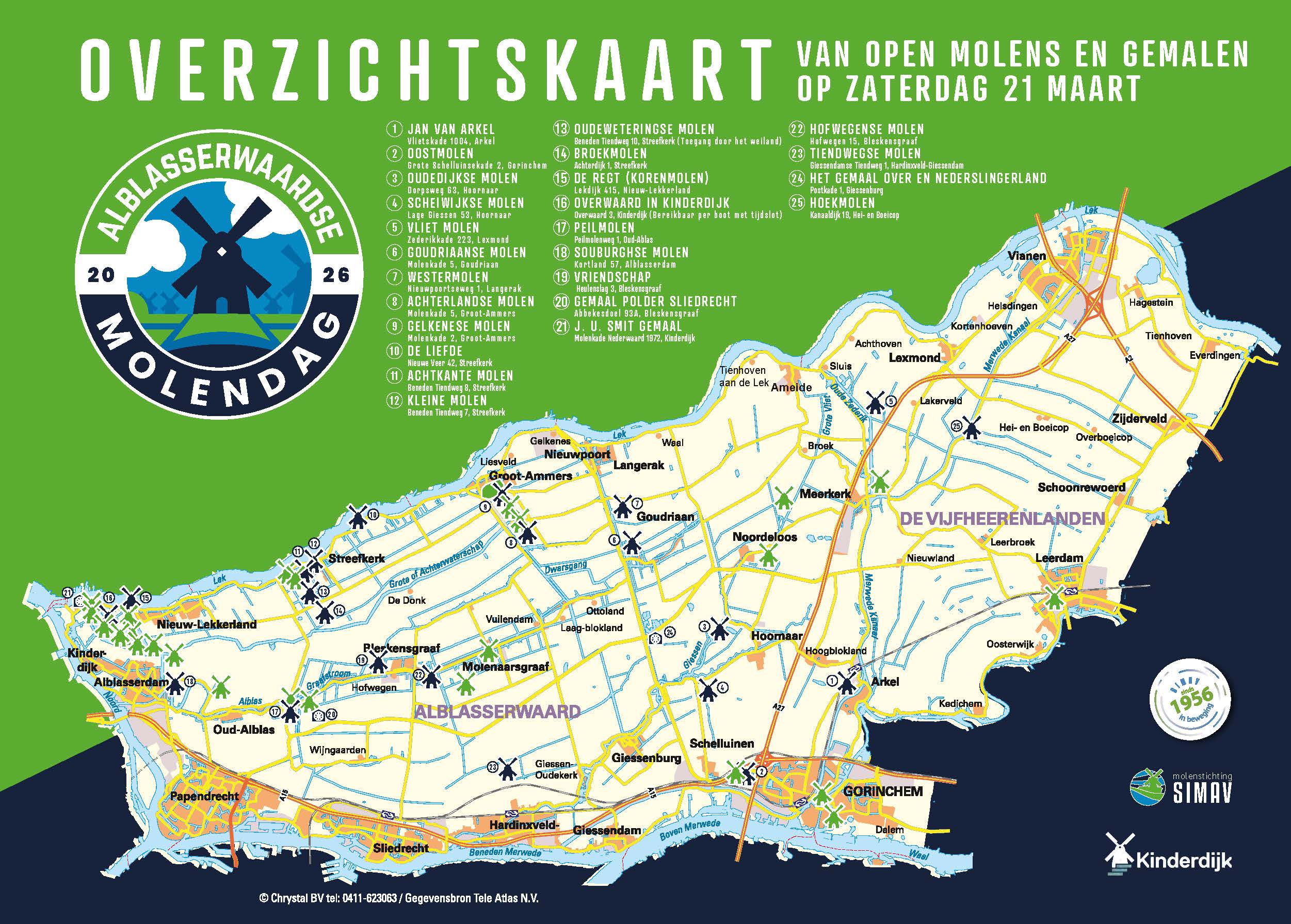 Tijdens de Alblasserwaardse Molendag op zaterdag 21 maart openen meerdere Simav molens en gemalen in de regio hun deuren voor publiek. Tussen 10.00 en 16.00 uur ben je van harte welkom om het waterbeheer, het molenaarsambacht en het bijzondere landschap van de Alblasserwaard van dichtbij te beleven. De deelnemende locaties zijn gratis te bezoeken.