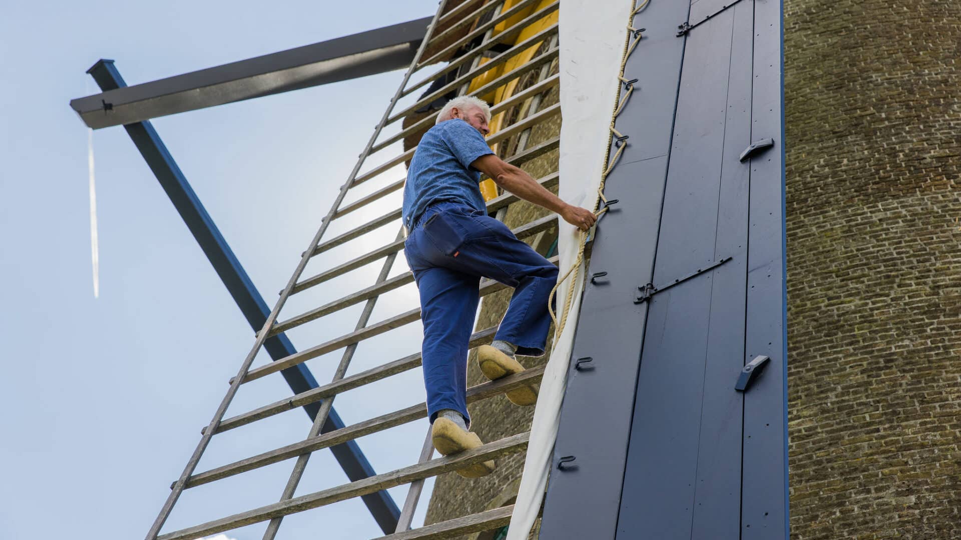 Wind is essentieel om de molens te laten malen. Daarom kijken molenaars altijd naar de lucht: wat is de weersverwachting? Ze kruien de molenkap in de juiste richting, klimmen naar boven om de zeilen voor te leggen (bij weinig wind) en halen de vang op. Klaar om het water te verplaatsen!