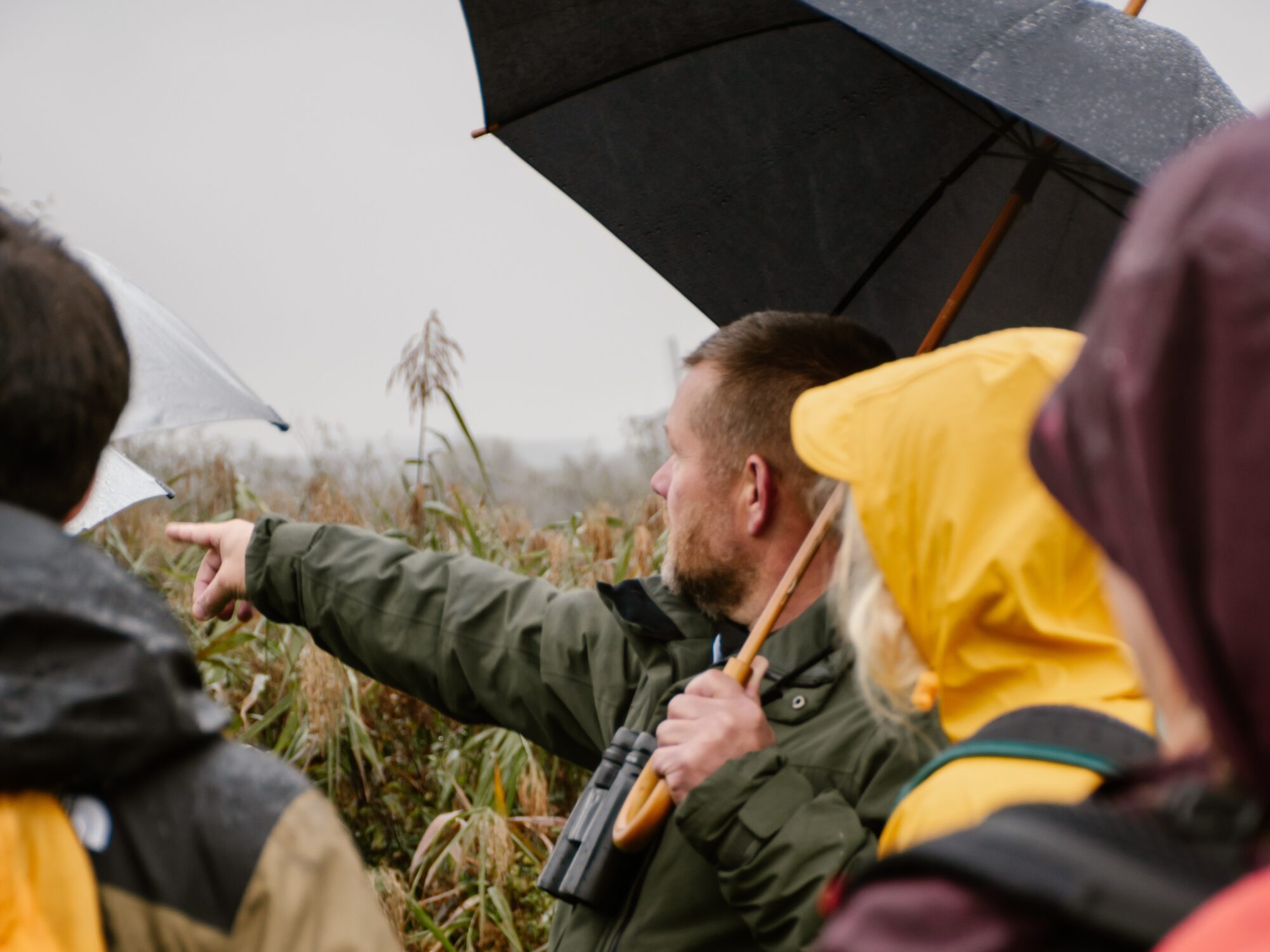 Gelukkig weerhield de regen de groep er niet van om toch nog dit prachtige natuurgebied te voet te verkennen. Met paraplu’s in de hand en uitgerust met tien hoogwaardige verrekijkers beschikbaar gesteld door onze sponsor Swarovski gingen de deelnemers op pad. Onderweg wees Richard hen bijvoorbeeld op sporen van bevers, leerden ze over de telpost voor vogelaars in Kinderdijk en gebruikten ze de verrekijkers om de overvliegende vogels van dichtbij te bekijken.